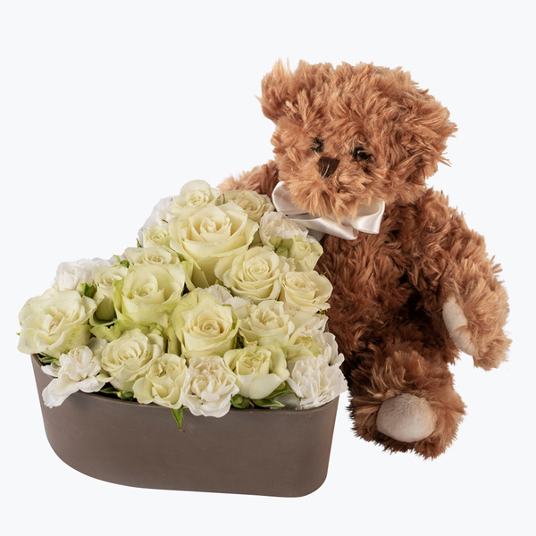 Et nydelig blomstrende hjerte i klassiske hvite toner som leveres sammen med vår herlige myke, Florabjørn. Enkelt å motta - kan settes rett på bordet.