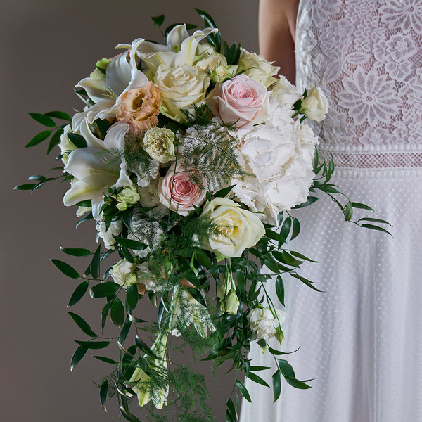 Dråpeformet brudebukett med et klassisk og elegant utseende. Her i delikat hvitt/krem med innslag av dus rosa og fersken. Andre ønsker? Ta kontakt med din lokale faghandel – sammen skaper vi din drøm!