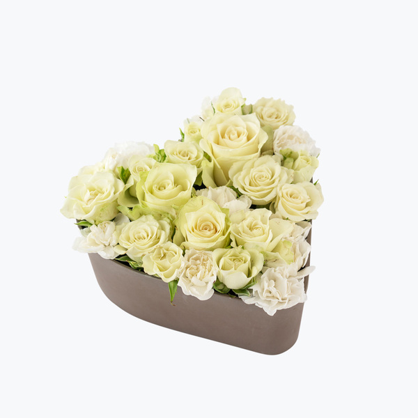 Et nydelig blomstrende hjerte i klassiske hvite toner. Enkelt å motta - kan settes rett på bordet. Vis mer