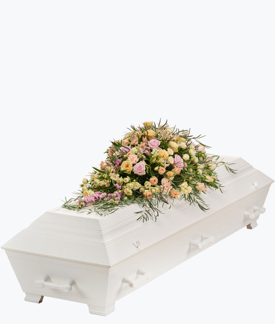 En frodig klassisk blomstrende dekorasjon til kisten fra de helt nærmeste. Kistepynten er i vakre pasteller og er et godt valg som en siste hilsen.