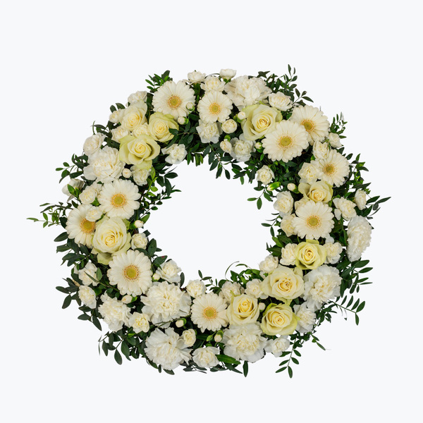 En delikat og vakker siste hilsen til båren. Kransen består av ulike hvite blomster som sammen skaper et stilrent og klassisk utrykk.