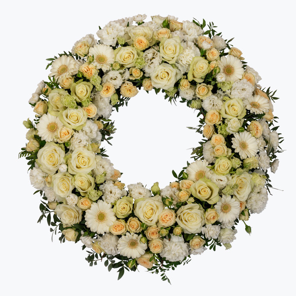 En praktfull, eksklusiv siste hilsen til et kjært familiemedlem, en trofast nær venn og /eller en god kollega. Kransen består av ulike hvite blomster som sammen skaper et blomstrende og klassisk utrykk.