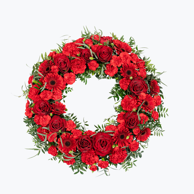 En varm og vakker siste hilsen til båren . Kransen består av ulike nydelige blomster i rødt. Vis mer