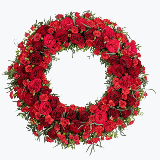 En varm og vakker siste hilsen til båren.Denne frodige kransen består av ulike nydelige blomster i rødt.