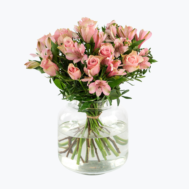 En harmonisk bukett som består av klassiske roser og alstromeria i rosatoner. Vasen følger ikke med.